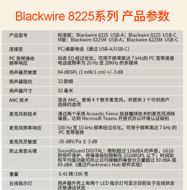 Blackwire 8225,BW8225,USB-A, 214406-01 Blackwire 8225,BW8225,Microsoft,USB-A,214408-01 • 凭借采用 Acoustic Fence 拾音魔球 技术强化的灵活降噪麦克风,屏蔽 身边谈话者和环境噪音; • 先进的混合主动降噪 (ANC) 技术提供 了三种设置可供选择,优化音质的同 时提高了舒适感; • 凭借可让其他人知道您是否处于通话 状态的通话指示灯,可防止同事打断 通话 ; • 强化的低音响应,可始终提供出众的 通话和媒体音质 ; • 设计轻巧(0.41 磅/186 克) ;完全可调式耳机,配有可 180º 旋转扬声器 ; • Microsoft Teams 版本拥有专门的 Teams 按钮,可实现即时访问。