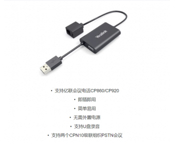 CPN10是亿联推出的一款用于连接会议电话CP860/CP920的PSTN转接盒,可以让原本只支持SIP网络的会议电话CP860/CP920同时支持PSTN网络,以此满足许多目前还在使用PSTN电话网络的国家和地区。通过将CP860/CP920和CPN10连接,您的会议室只需要一根PSTN电话线,就可以使用专业级的会议电话。与此同时,搭配上CP860/CP920内置的3个麦克风阵列、全双工技术、回音消除技术以及丰富的话机功能,如会议录播、手机联动等,让您在会议室中轻松获得更便捷、更真实、更丰富的会议通话体验。